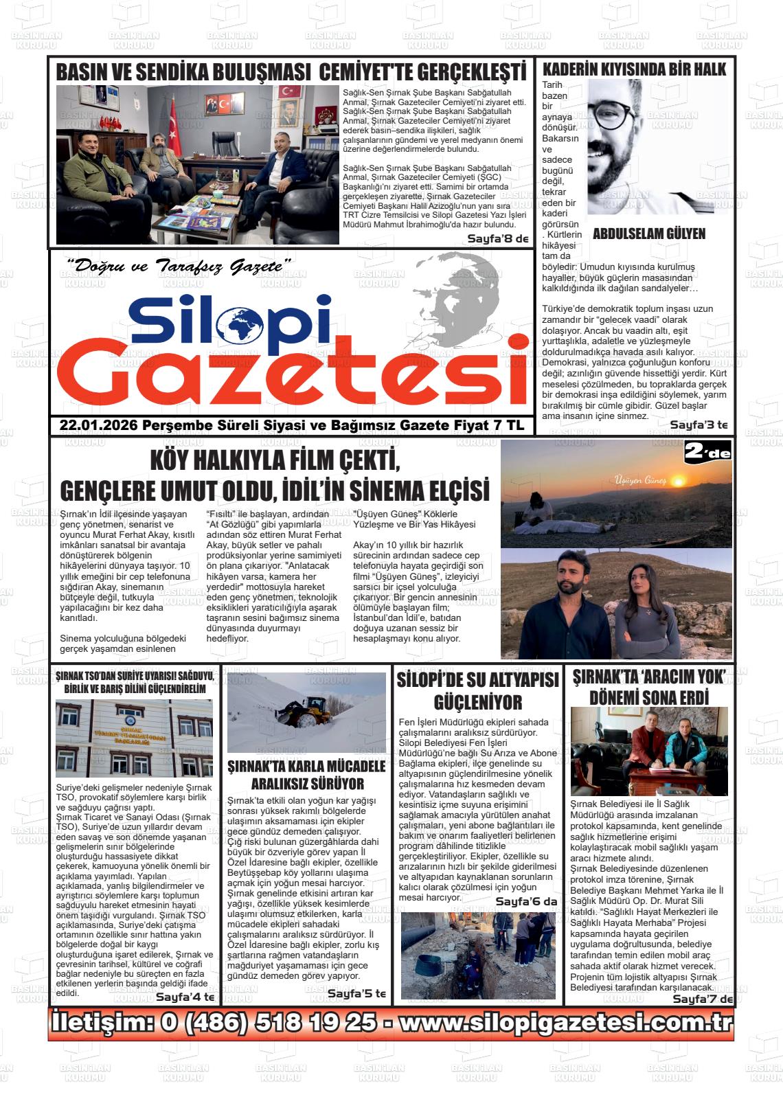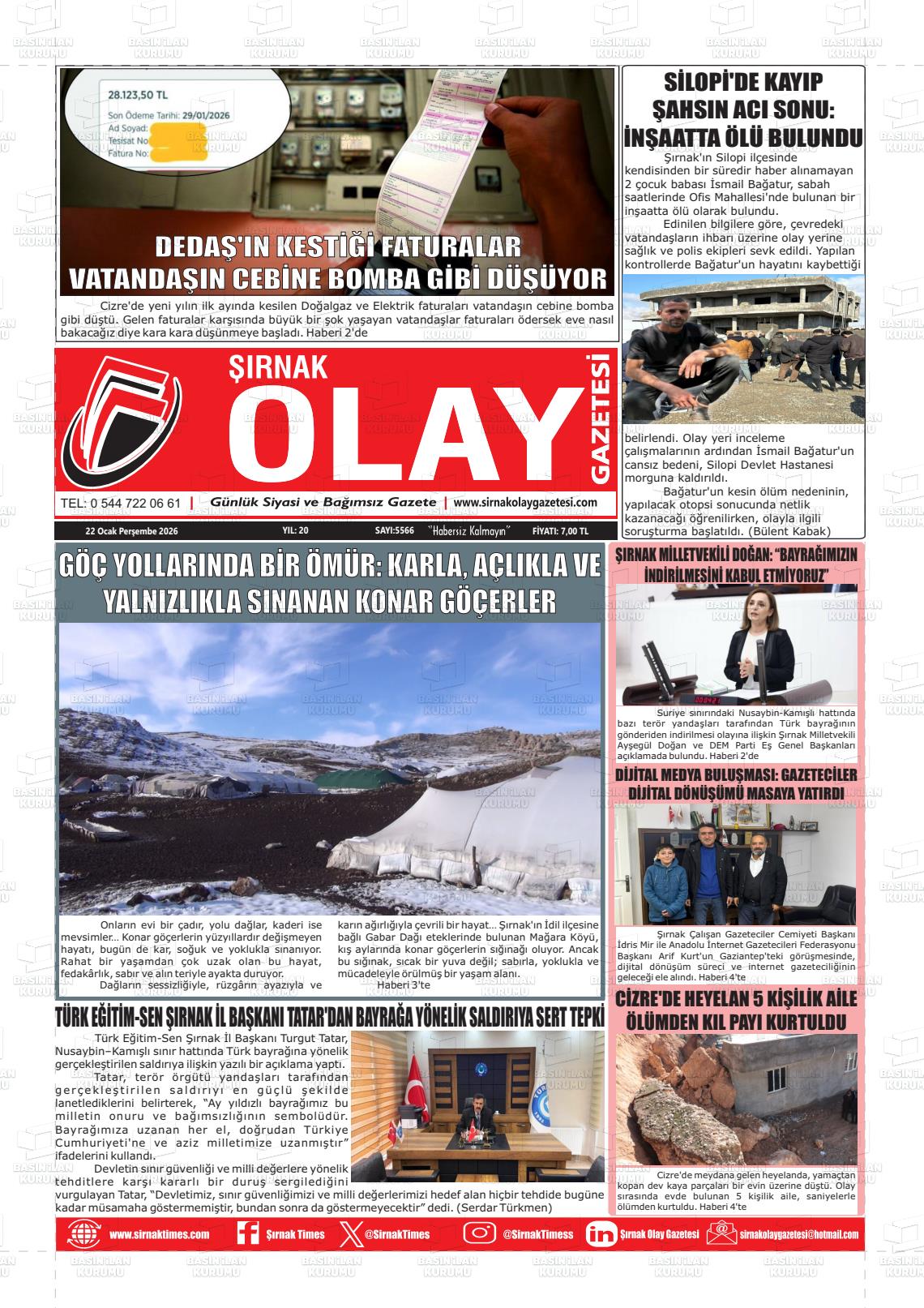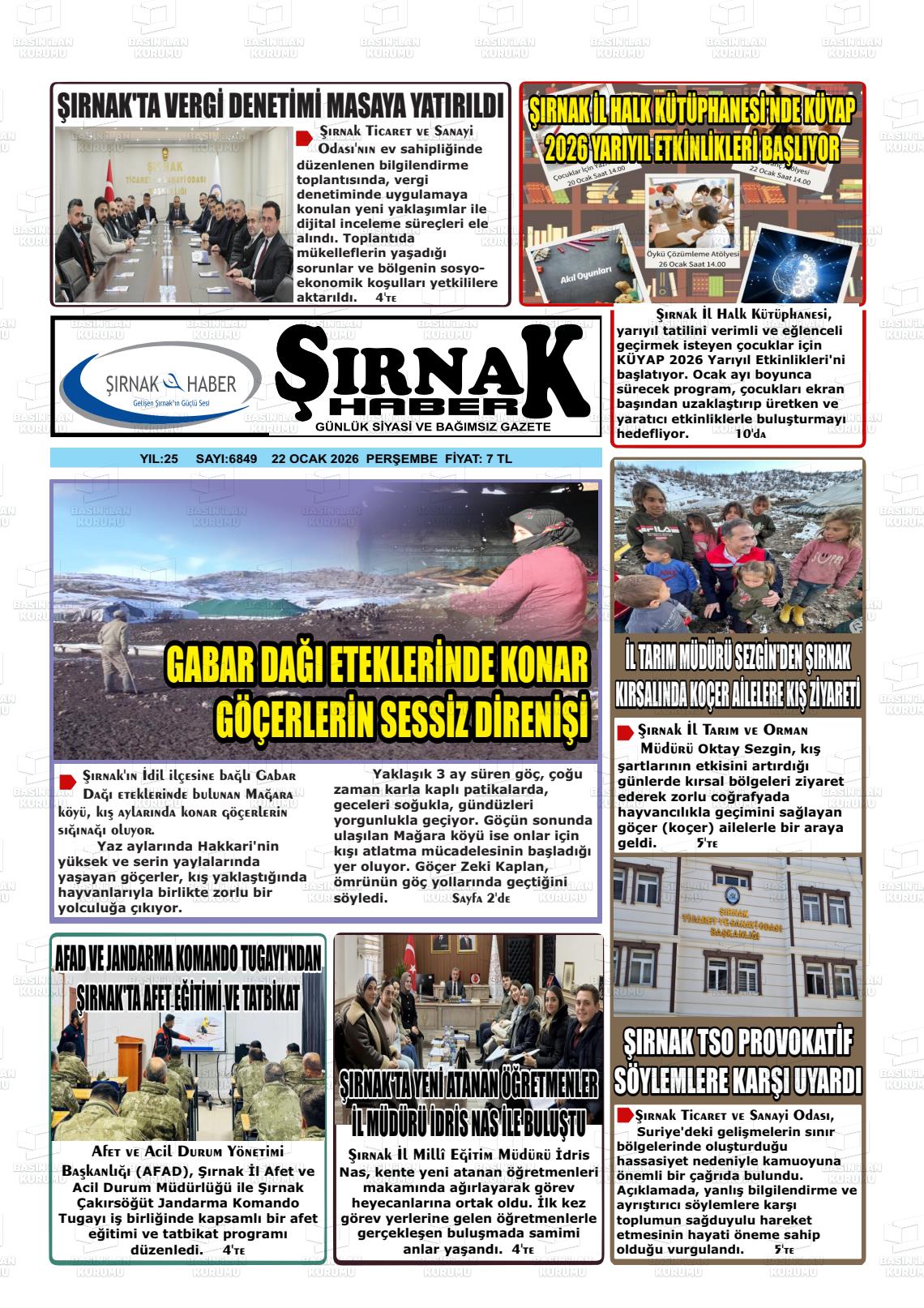 Şırnak Yerel Gazeteleri 22 Ocak 2026, Perşembe Günü Manşeti
