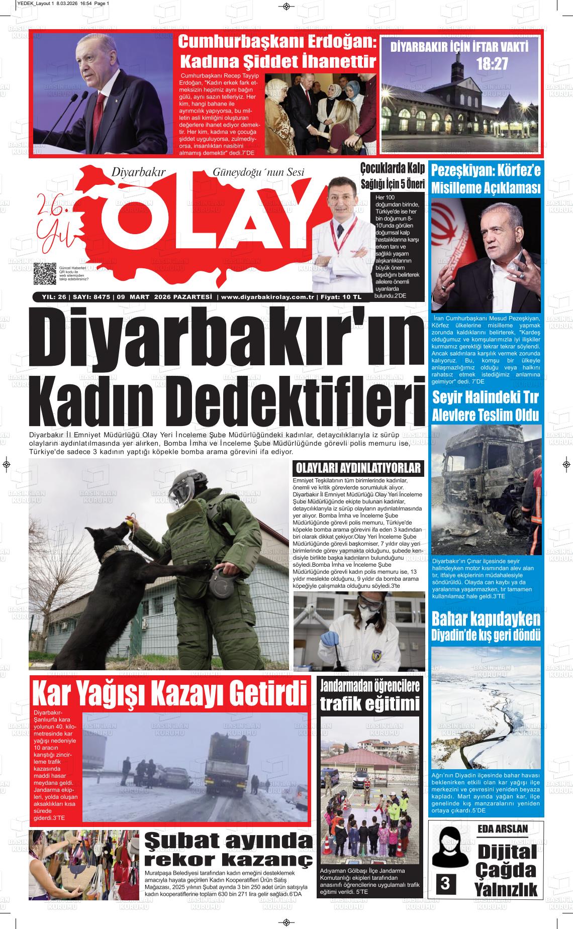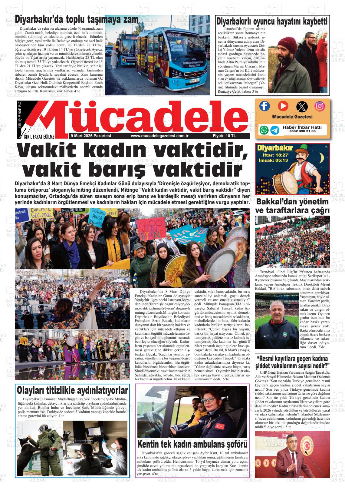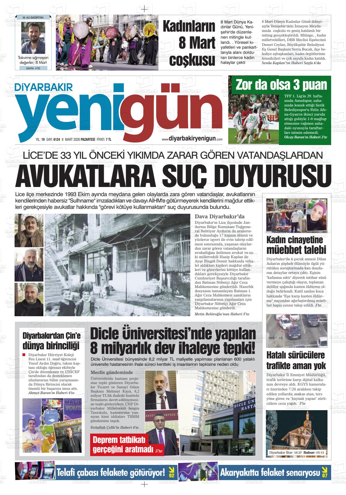 Dİyarbakır Yerel Gazeteleri 09 Mart 2026, Pazartesi Günü Manşeti