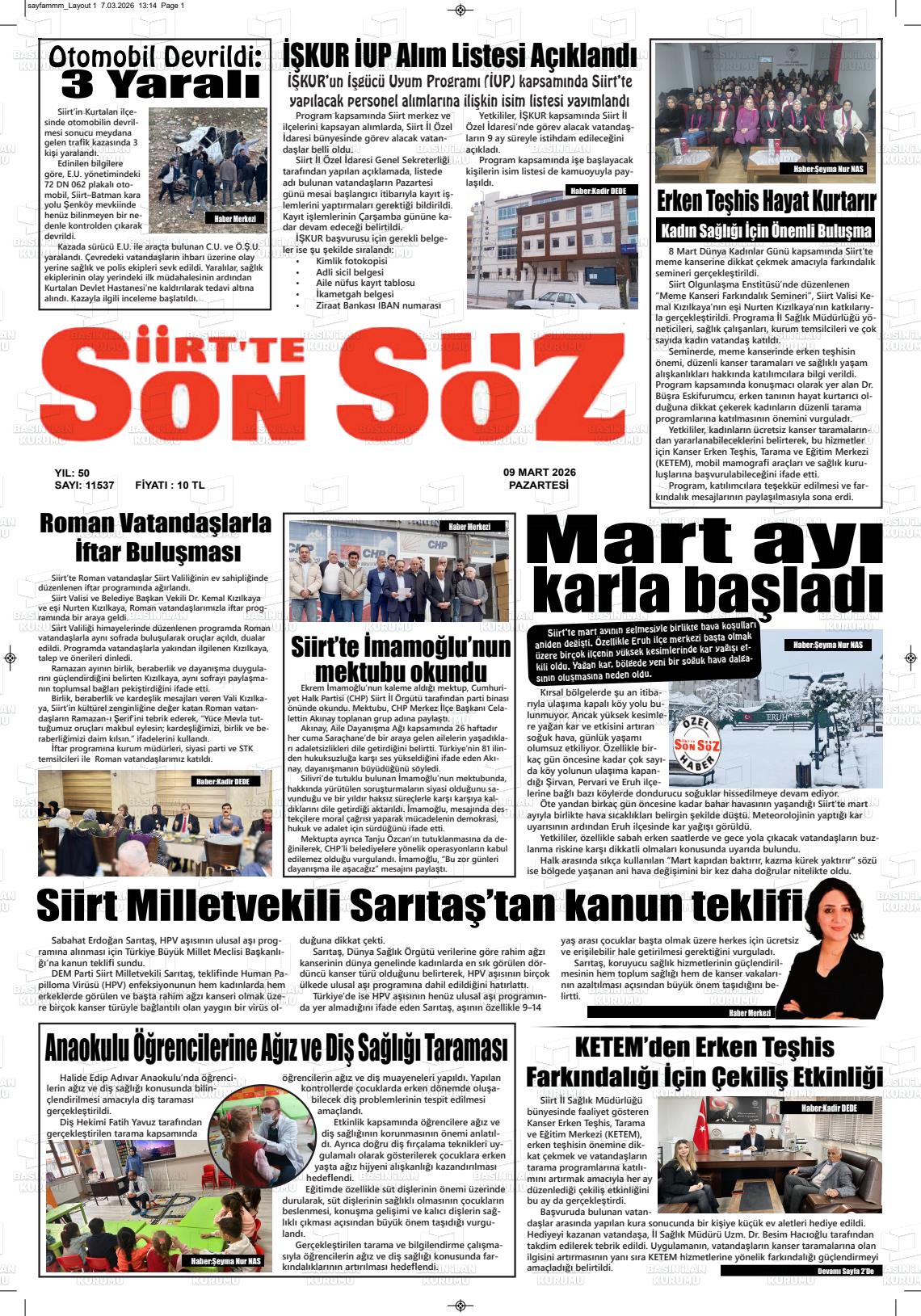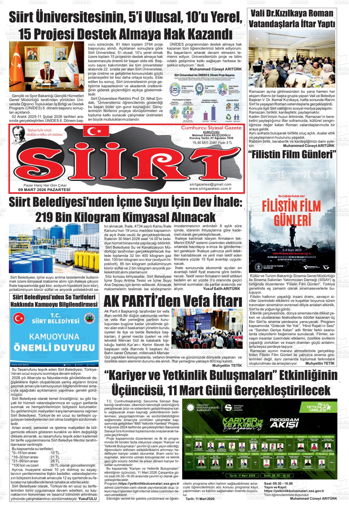 Sİİrt Yerel Gazeteleri 09 Mart 2026, Pazartesi Günü Manşeti